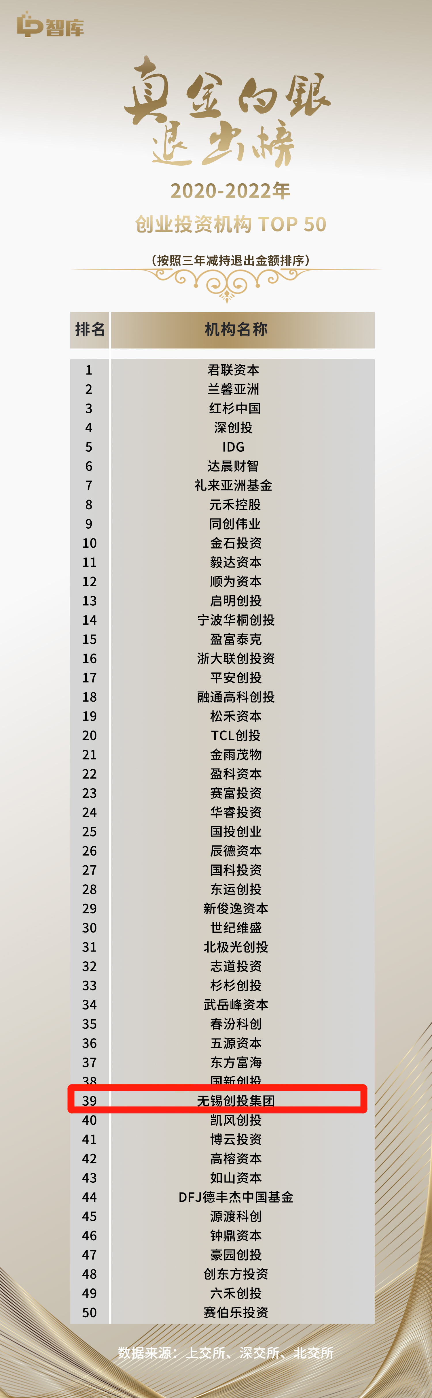 | 創(chuàng)投集團榮獲《真金白銀退出榜》2020-2022年創(chuàng)業(yè)投資機構(gòu)TOP50榜第39名 |