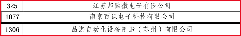 近日,江蘇省工信廳發(fā)布了《關(guān)于江蘇省2024年度省級(jí)專精特新中小企業(yè)(第二批)和 2021年度省級(jí)專精特新中小企業(yè)復(fù)核通過企業(yè)名單的公示》,江蘇邦融微電子有限公司、南京百識(shí)電子科技有限公司、品湛自動(dòng)化設(shè)備制造(蘇州)有限公司3家創(chuàng)投集團(tuán)被投企業(yè)入選第二批專精特新中小企業(yè)。